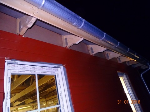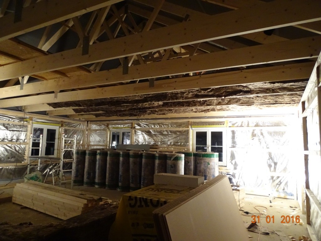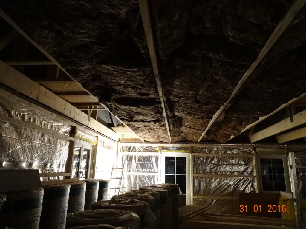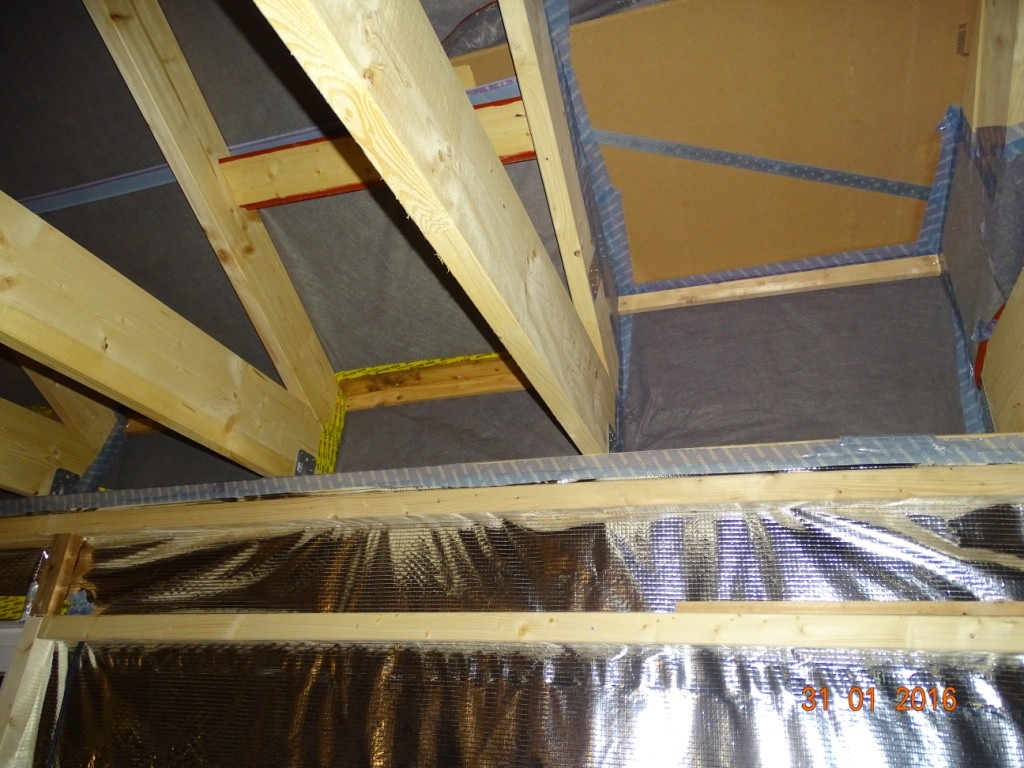 In den letzten Tagen hat Nils immer mal wieder zwischendurch das Abdichten der Lücke zwischen Decke und Dach vorbereitet, dazu mussten diverse Latten gesägt und verschraubt werden und nun kommen Platten aus Presspappe in die Zwischenräume und werden festgenagelt. Da Daddy und ich nachmittags die Installationsebene komplett fertig haben, beginnen wir mit der Dämmung der Decke von der Seite aus beginnend, wo Nils die Pappen schon drin und auch alles verklebt hat. Hier sieht man die Pappen im Zwischenraum von außen.