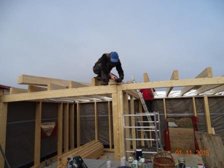 Am Ende des 12. Tages ist die Decke fertig. Leider kann ich davon kein Photo mehr machen, es ist schon dunkel. Hier ist aber gut zu sehen, dass fast die gesamte Fläche bereits mit Platten bedeckt ist. Damit haben wir ein Zwischenziel erreicht: Morgen kommt Richtmeister Tamm mit seinen Jungs und wird unser Dach richten. Da die Decke fertig ist, können sich die Zimmermänner gut bewegen und unser Dach aufstellen. Ich bin wahnsinnig gespannt, wie das morgen aussehen wird!