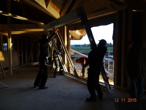 Der Morgen begann mit Baggerfahrer oder besser Radladerfahrer Klaus, der den Dachdeckern ein wenig unter die Arme gegriffen hat und die Dachpfannen auf das Dach befördert hat. Die Dachdecker haben diese erst einmal in Reihen abgelegt und dann fleißig eingedeckt. Am Ende des Tages haben wir nun eine Dachrinne beginnend in der rechten Kehle an der Terasse bis vorne vor die Haustür und zwei eingedeckte Dachflächen.