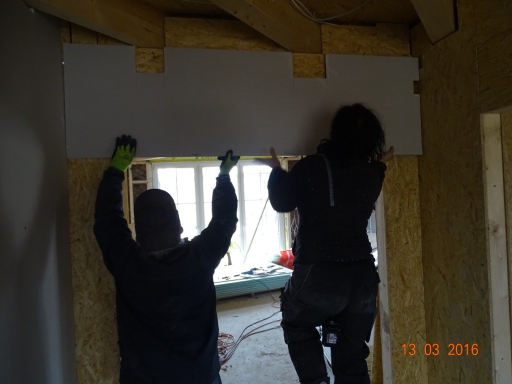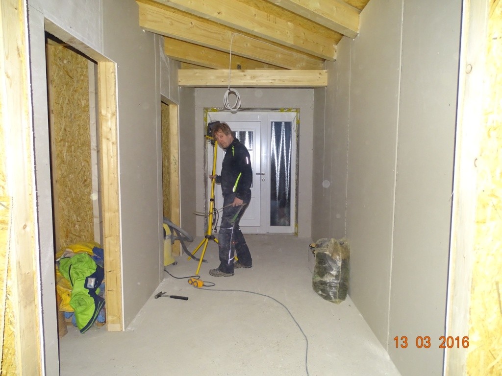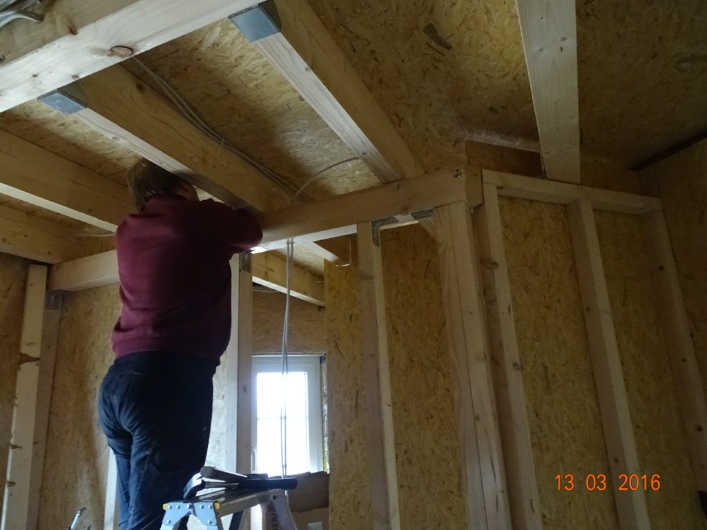 Hier sieht man schön, wie so eine Wand aufgebaut ist. Hinen an der Tür dämmt mein Vater gerade den Zwischenraum aus. Dann kommt auch auf der zweiten Seite OSB an die Wand und zum Abschluss Rigips.
