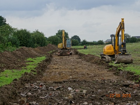 Wir beginnen mit unserer Baustrasse, die später der Privatweg zu beiden Häusern werden wird. Bis zu unserem Haus sind es knapp 100 m, zunächst wird der Mutterboden abgetragen und dann wird mit Bauschutt wieder aufgefüllt. Oben kommt feinkörnigeres Recyclingmaterial drüber, schließlich möchte man sich nicht alle Reifen kaputt fahren :-)