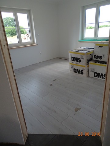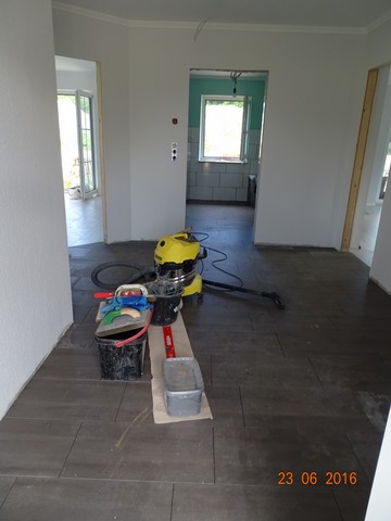 Eigentlich hatten wir schon damit gerechnet, dass das Gäste-WC bis zum Einzug nicht fertig werden würde. Dem ist auch so, allerdings ist es hier schon einmal gefliest. Im kleinen Haus sind wir nun deutlich weiter als in unserem Haus, ist ja auch kein Wunder, wir hatten ja auch sechs Wochen Baustopp... Zum Glück geht es bei uns jetzt auch wieder voran mit Tapeten und Farbe...