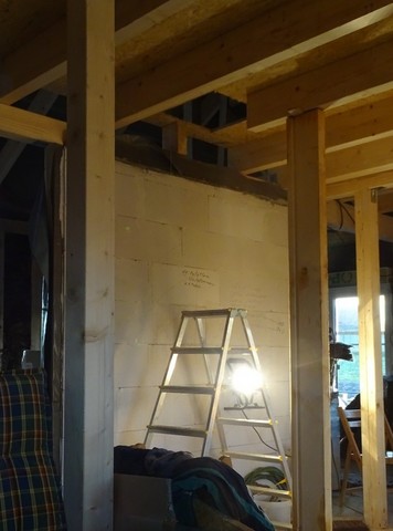 Hinter dem provisorischen Schneidetisch für die Dämmung musste die Steinwolle auch noch an die Außenwand. Also haben wir den Tisch abgebaut und die Außenwand endlich endgültig zu Ende gedämmt.