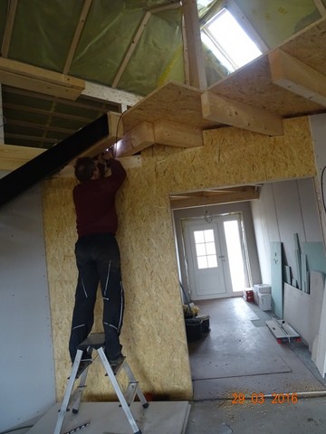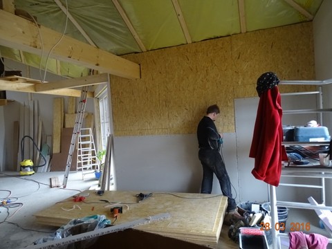 So langsam neigen sich unsere Rigipsvorräte dem Ende entgegen, jetzt werden nicht nur die grünen Feuchtraumplatten knapp, sondern auch die Aussen- und Innenwandplatten. Nach und nach schließen sich die Lücken und wir verdecken immer mehr OSB-Platten, so dass sich die Optik doch schon mal stark verändert auf immerhin weißgrau mit vielen schwarzen Schrauben drin. Hier wird die hohe Außenwand im Wohnzimmer geschlossen.