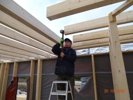 Seit gefühlten Wochen arrangieren wir nun schon unsere Deckenbalken. Gleich heute morgen werden die letzten der gestern gelegten Balken angenagelt, da stellen wir fest, dass wir im Eifer des Gefechts einige Balken vertauscht haben. Zwischen den normalen 8x20 Deckenbalken werden immer mal wieder dickere Balken eingeschoben und diese hatten wir gestern vertauscht. Also war der Rest des Vormittags dem Lösen der genagelten Winkelverbindungen und dem mühsamen Umtauschen der schwere Balken gewidmet. Später mussten wir dann noch einige der dickeren Exemplare an Ort und Stelle bringen, da wir heute nur zu dritt waren und ich eine davon, ein schweres Unterfangen im wahrsten Sinne des Wortes. Glücklicherweise haben wir schon viele Balken fest vernagelt liegen zum Ablegen der neuen Balken, mit der richtigen Technik (ein Ende des Balkens hochschieben bis er kippt und sich quasi von selbst hochzieht) ging es dann aber doch erstaunlich gut.